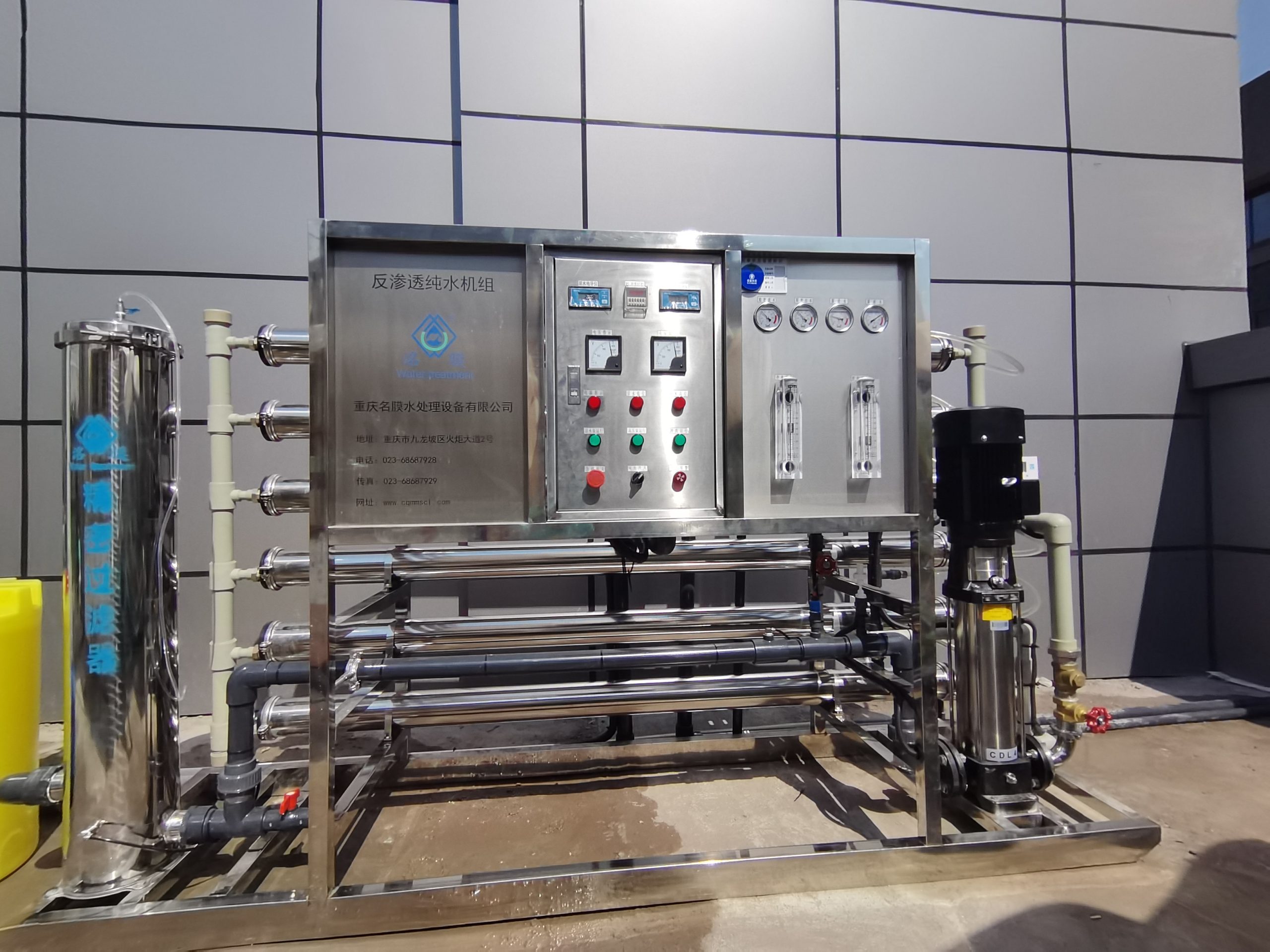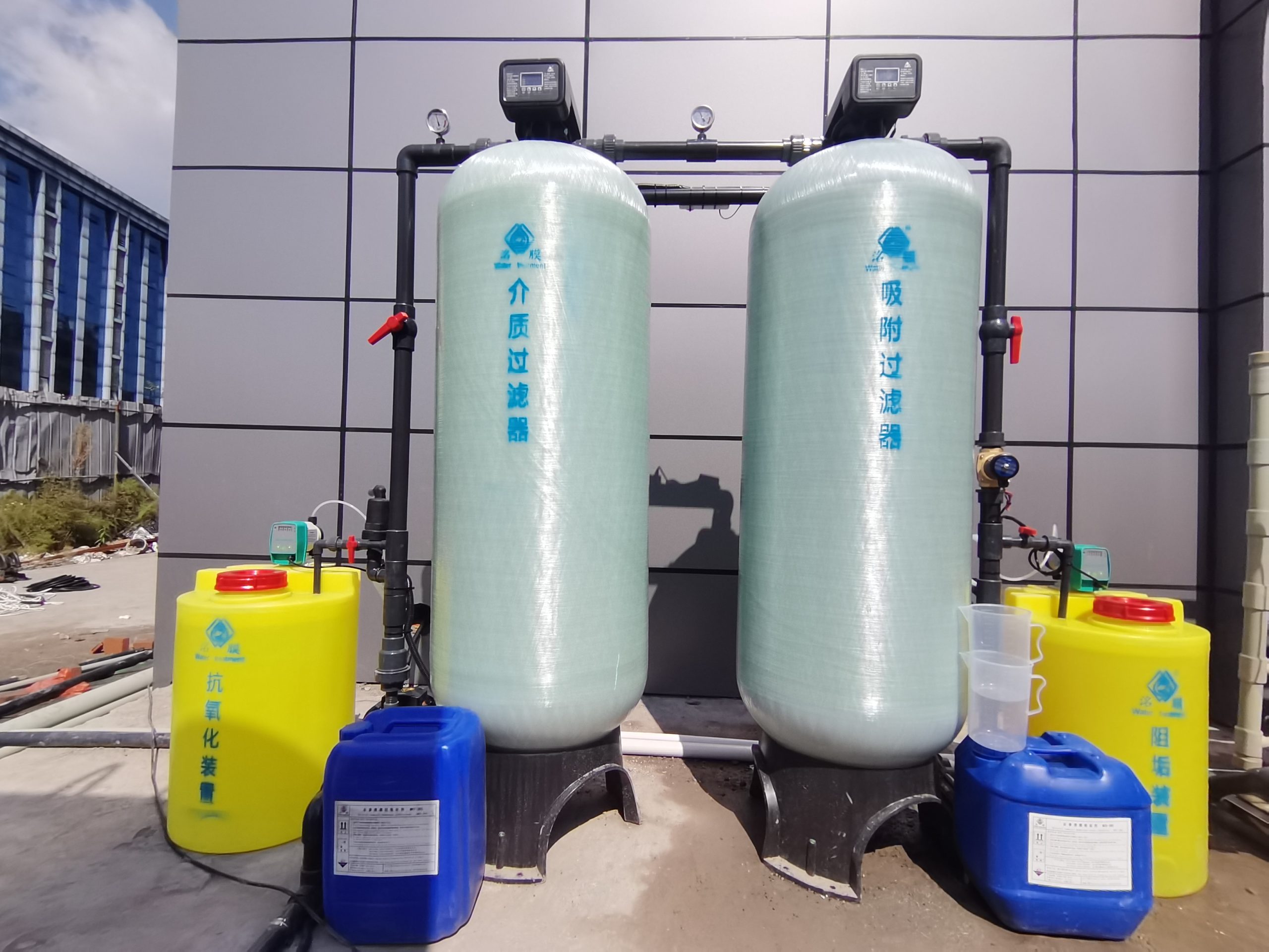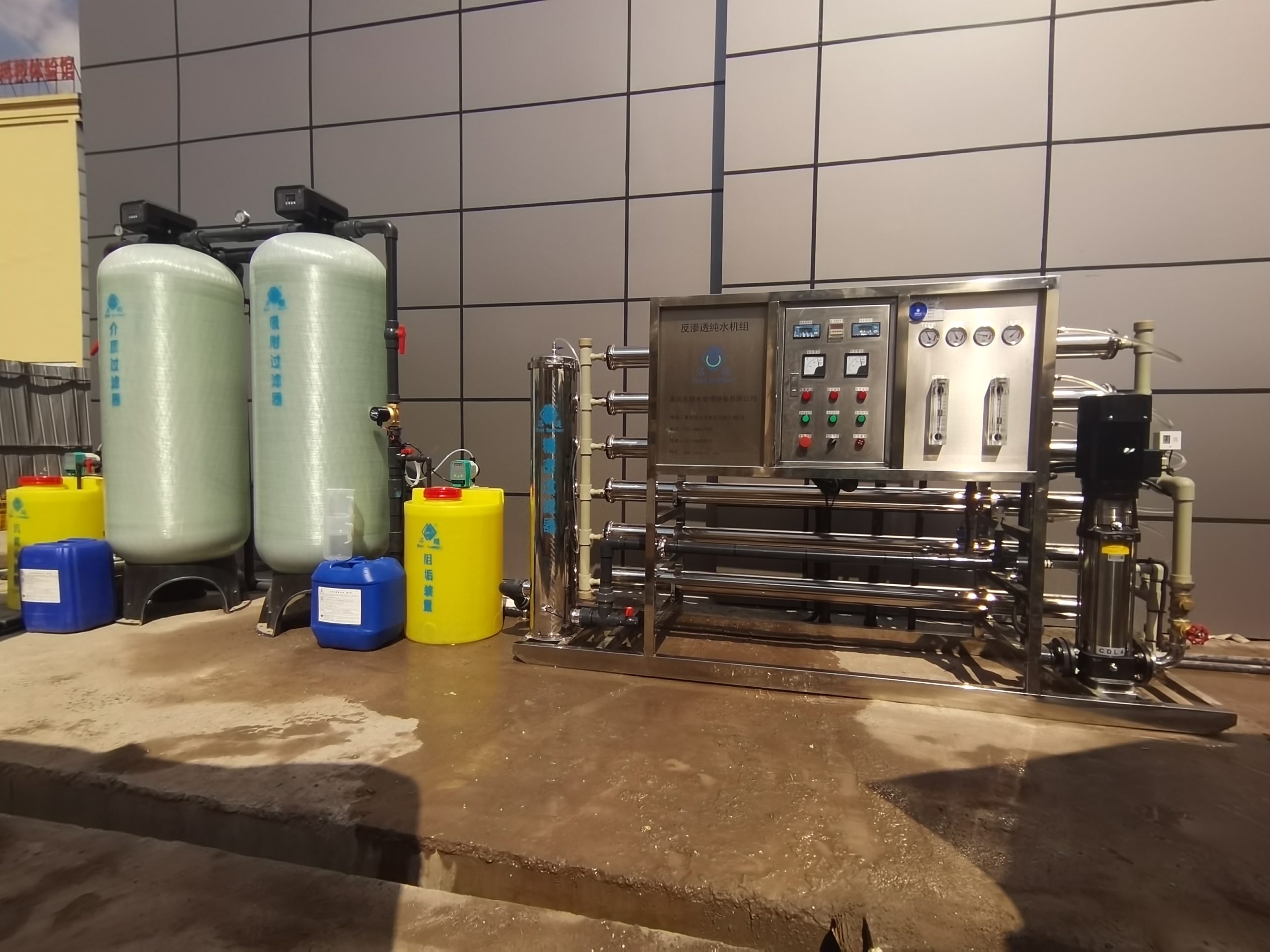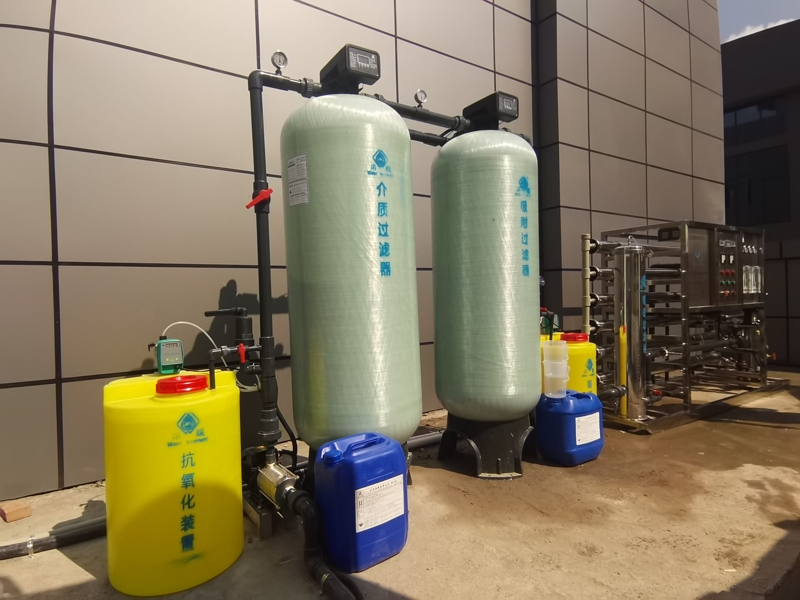 設(shè)備工藝:原水箱——原水泵——抗氧化裝置——介質(zhì)過(guò)濾器——吸附過(guò)濾器——阻垢裝置——精密過(guò)濾器——高壓泵—— Ro膜——純水箱